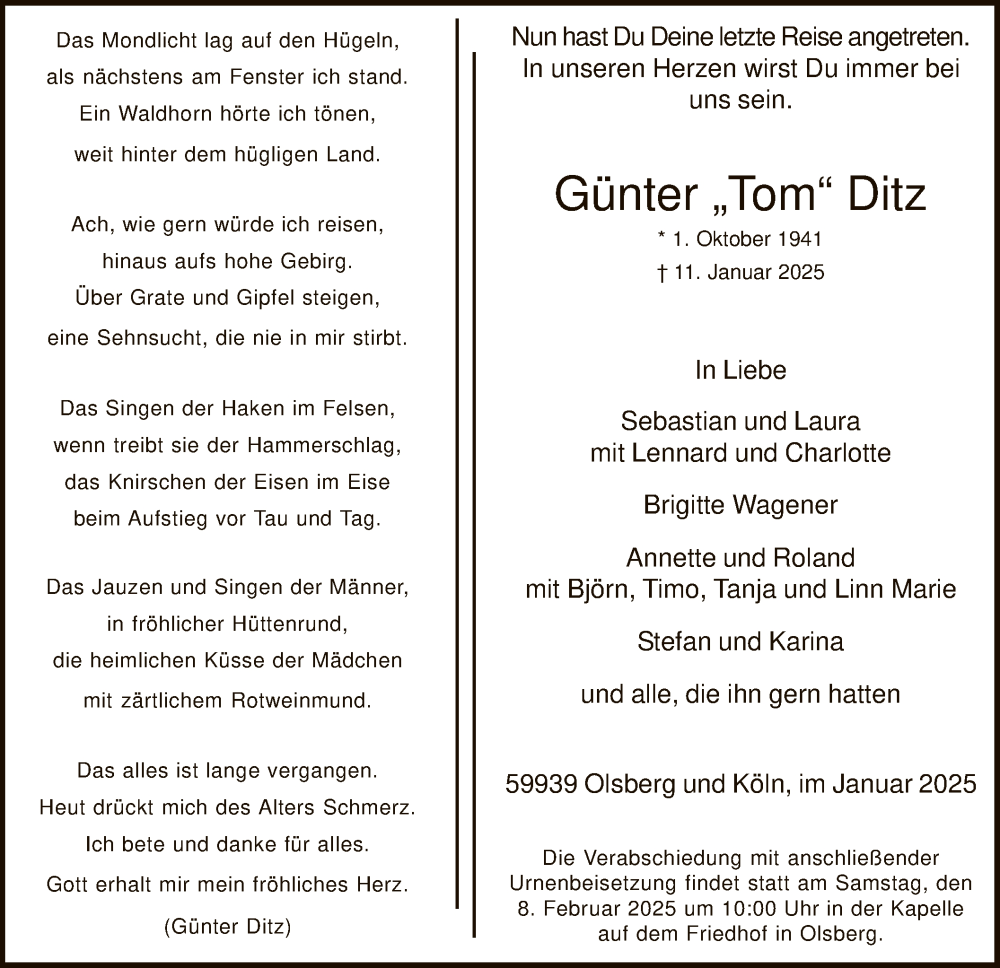 Hier finden Sie alle Traueranzeigen aus der Zeitung, die bisher für Günter Ditz erschienen sind. Weitere Traueranzeigen, die in der Zeitung erscheinen, werden hier ebenfalls aufgelistet