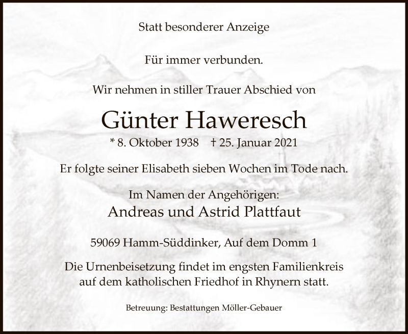 Hier finden Sie alle Traueranzeigen aus der Zeitung, die bisher für Günter Haweresch erschienen sind. Weitere Traueranzeigen, die in der Zeitung erscheinen, werden hier ebenfalls aufgelistet