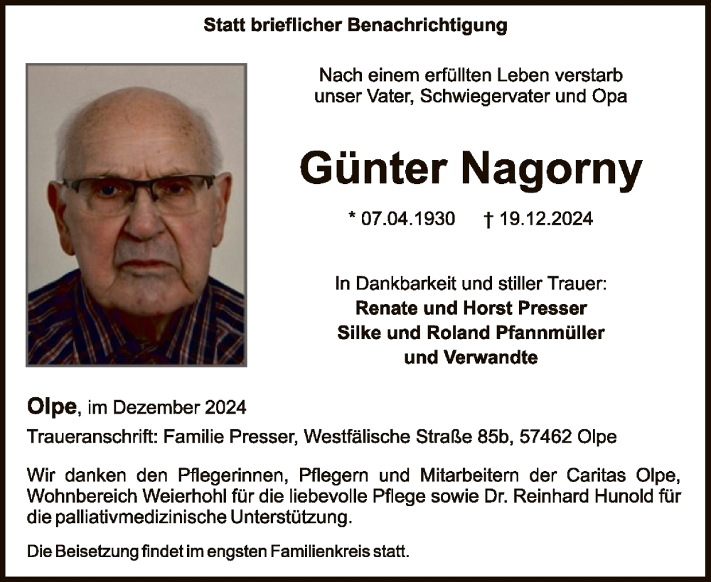 Hier finden Sie alle Traueranzeigen aus der Zeitung, die bisher für Günter Nagorny erschienen sind. Weitere Traueranzeigen, die in der Zeitung erscheinen, werden hier ebenfalls aufgelistet