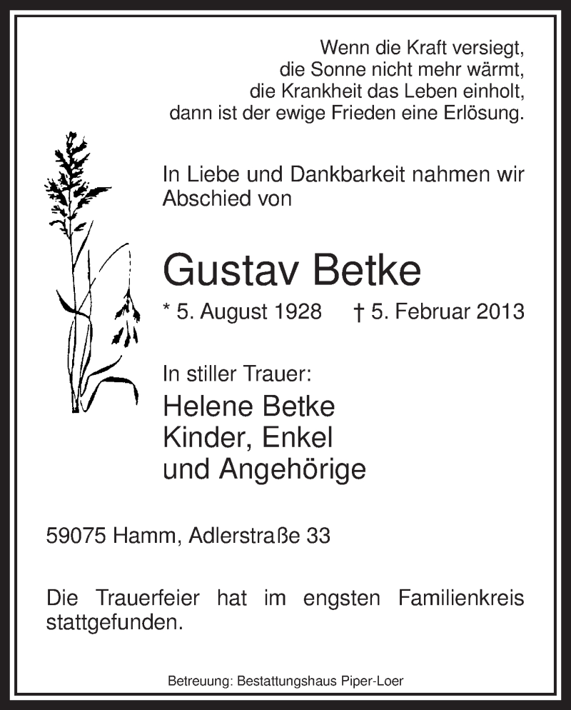 Hier finden Sie alle Traueranzeigen aus der Zeitung, die bisher für Gustav Betke erschienen sind. Weitere Traueranzeigen, die in der Zeitung erscheinen, werden hier ebenfalls aufgelistet