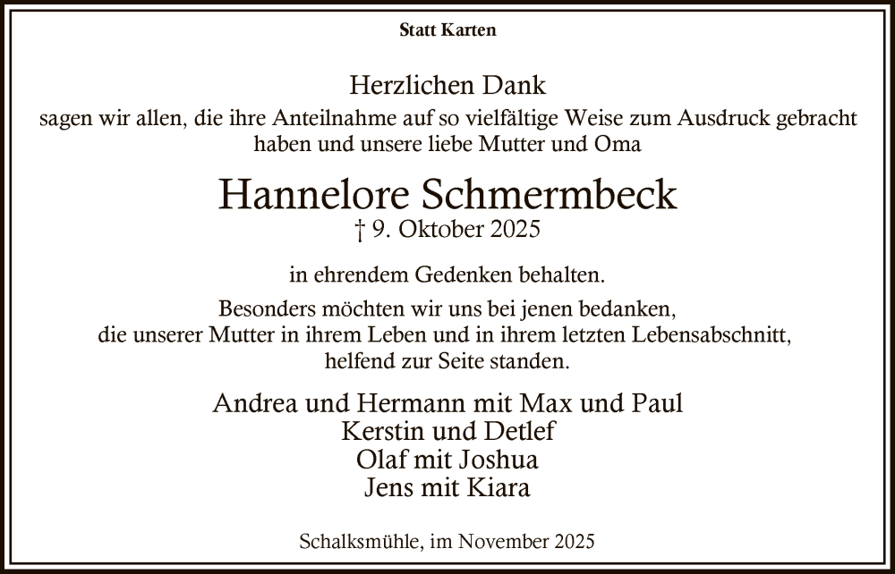 Hier finden Sie alle Traueranzeigen aus der Zeitung, die bisher für Hannelore Schmermbeck erschienen sind. Weitere Traueranzeigen, die in der Zeitung erscheinen, werden hier ebenfalls aufgelistet