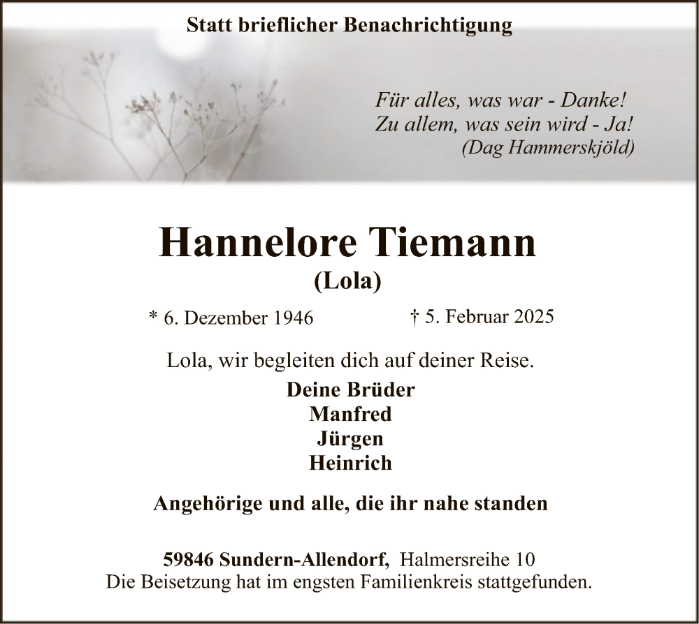 Hier finden Sie alle Traueranzeigen aus der Zeitung, die bisher für Hannelore Tiemann erschienen sind. Weitere Traueranzeigen, die in der Zeitung erscheinen, werden hier ebenfalls aufgelistet