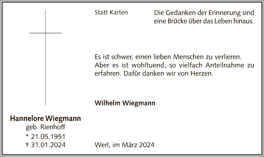 Hier finden Sie alle Traueranzeigen aus der Zeitung, die bisher für Hannelore Wiegmann erschienen sind. Weitere Traueranzeigen, die in der Zeitung erscheinen, werden hier ebenfalls aufgelistet