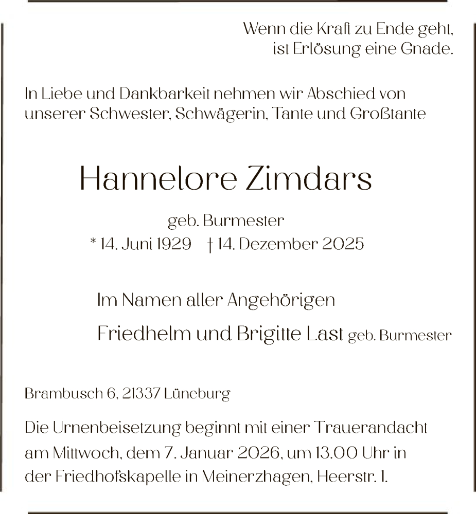 Hier finden Sie alle Traueranzeigen aus der Zeitung, die bisher für Hannelore Zimdars erschienen sind. Weitere Traueranzeigen, die in der Zeitung erscheinen, werden hier ebenfalls aufgelistet
