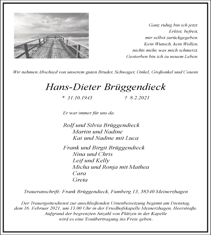 Hier finden Sie alle Traueranzeigen aus der Zeitung, die bisher für Hans-Dieter Brüggendieck erschienen sind. Weitere Traueranzeigen, die in der Zeitung erscheinen, werden hier ebenfalls aufgelistet