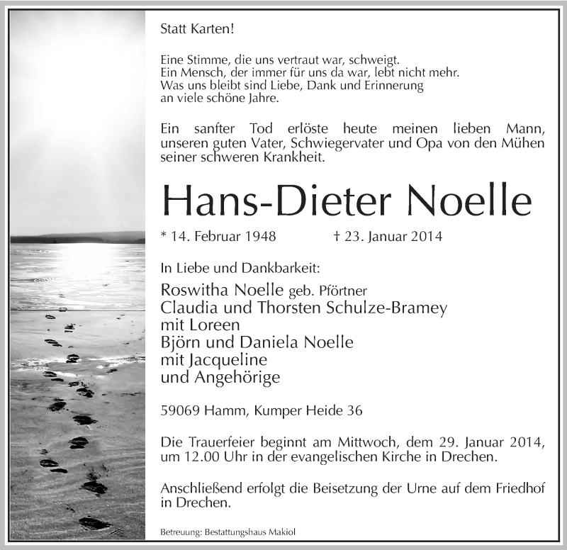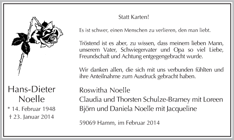 Hier finden Sie alle Traueranzeigen aus der Zeitung, die bisher für Hans-Dieter Noelle erschienen sind. Weitere Traueranzeigen, die in der Zeitung erscheinen, werden hier ebenfalls aufgelistet
