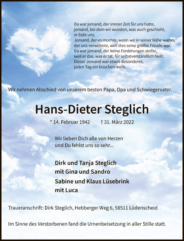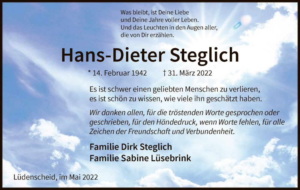 Hier finden Sie alle Traueranzeigen aus der Zeitung, die bisher für Hans-Dieter Steglich erschienen sind. Weitere Traueranzeigen, die in der Zeitung erscheinen, werden hier ebenfalls aufgelistet
