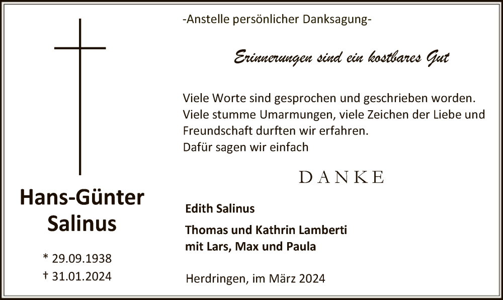 Hier finden Sie alle Traueranzeigen aus der Zeitung, die bisher für Hans-Günter Salinus erschienen sind. Weitere Traueranzeigen, die in der Zeitung erscheinen, werden hier ebenfalls aufgelistet
