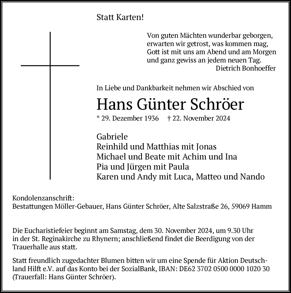 Hier finden Sie alle Traueranzeigen aus der Zeitung, die bisher für Hans Günter Schröer erschienen sind. Weitere Traueranzeigen, die in der Zeitung erscheinen, werden hier ebenfalls aufgelistet