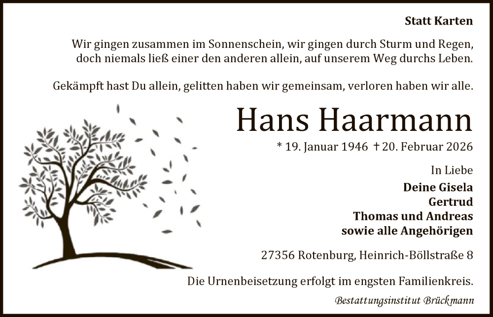 Hier finden Sie alle Traueranzeigen aus der Zeitung, die bisher für Hans Haarmann erschienen sind. Weitere Traueranzeigen, die in der Zeitung erscheinen, werden hier ebenfalls aufgelistet