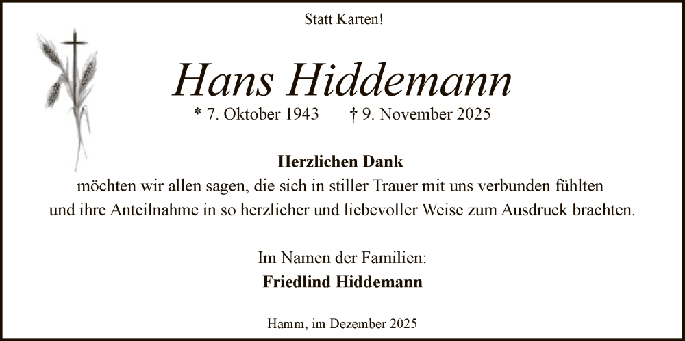 Hier finden Sie alle Traueranzeigen aus der Zeitung, die bisher für Hans Hiddemann erschienen sind. Weitere Traueranzeigen, die in der Zeitung erscheinen, werden hier ebenfalls aufgelistet