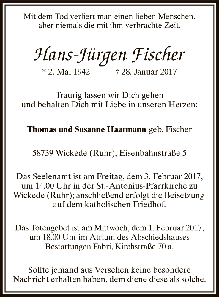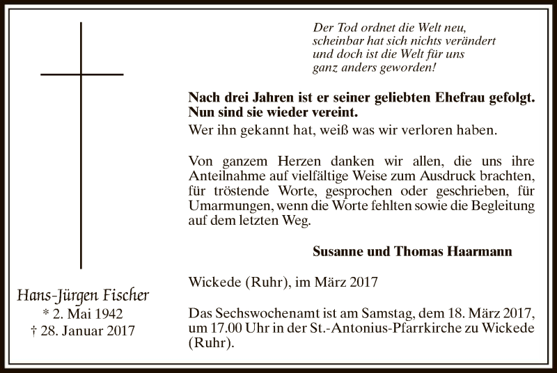 Hier finden Sie alle Traueranzeigen aus der Zeitung, die bisher für Hans-Jürgen Fischer erschienen sind. Weitere Traueranzeigen, die in der Zeitung erscheinen, werden hier ebenfalls aufgelistet