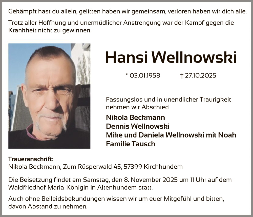 Hier finden Sie alle Traueranzeigen aus der Zeitung, die bisher für Hansi Wellnowski erschienen sind. Weitere Traueranzeigen, die in der Zeitung erscheinen, werden hier ebenfalls aufgelistet