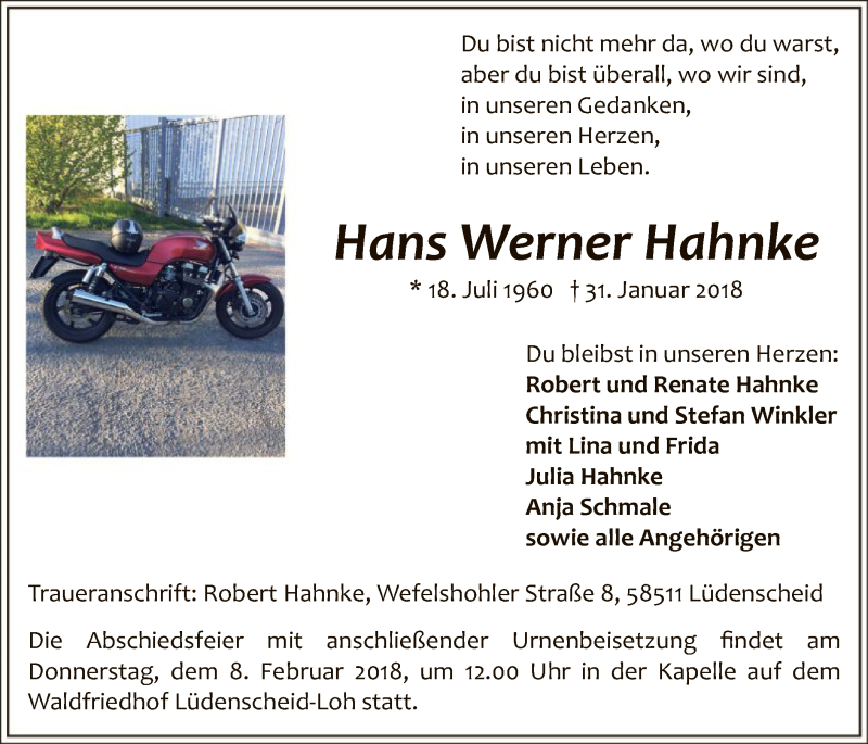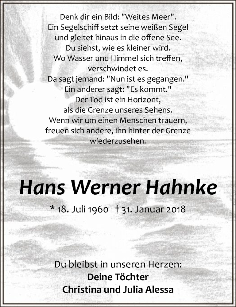 Hier finden Sie alle Traueranzeigen aus der Zeitung, die bisher für Hans Werner Hahnke erschienen sind. Weitere Traueranzeigen, die in der Zeitung erscheinen, werden hier ebenfalls aufgelistet