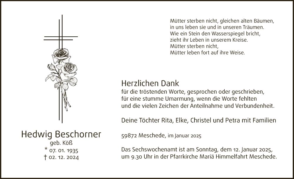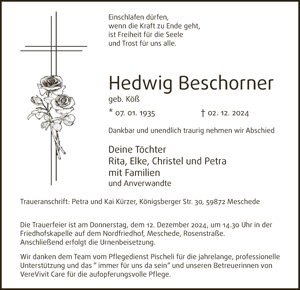 Hier finden Sie alle Traueranzeigen aus der Zeitung, die bisher für Hedwig Beschorner erschienen sind. Weitere Traueranzeigen, die in der Zeitung erscheinen, werden hier ebenfalls aufgelistet