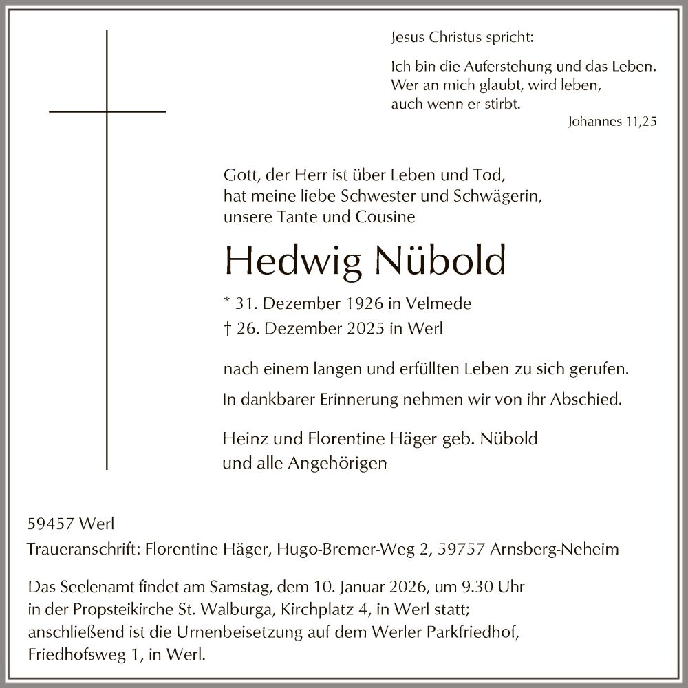 Hier finden Sie alle Traueranzeigen aus der Zeitung, die bisher für Hedwig Nübold erschienen sind. Weitere Traueranzeigen, die in der Zeitung erscheinen, werden hier ebenfalls aufgelistet