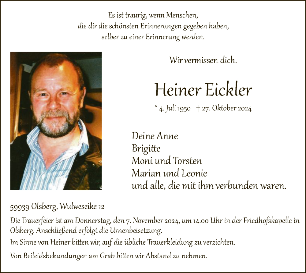 Hier finden Sie alle Traueranzeigen aus der Zeitung, die bisher für Heiner Eickler erschienen sind. Weitere Traueranzeigen, die in der Zeitung erscheinen, werden hier ebenfalls aufgelistet