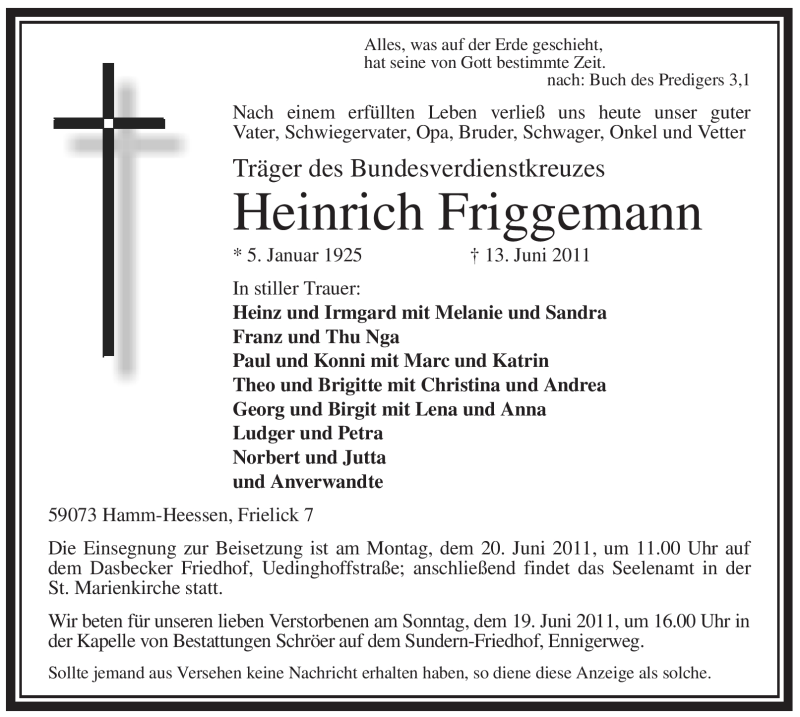 Hier finden Sie alle Traueranzeigen aus der Zeitung, die bisher für Heinrich Friggemann erschienen sind. Weitere Traueranzeigen, die in der Zeitung erscheinen, werden hier ebenfalls aufgelistet