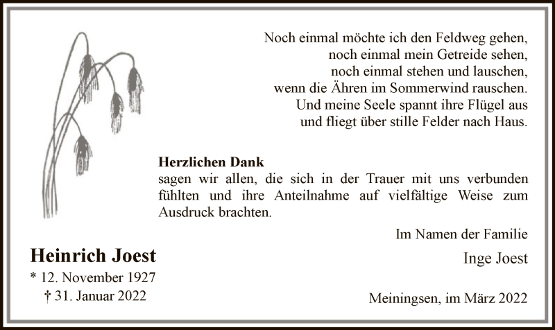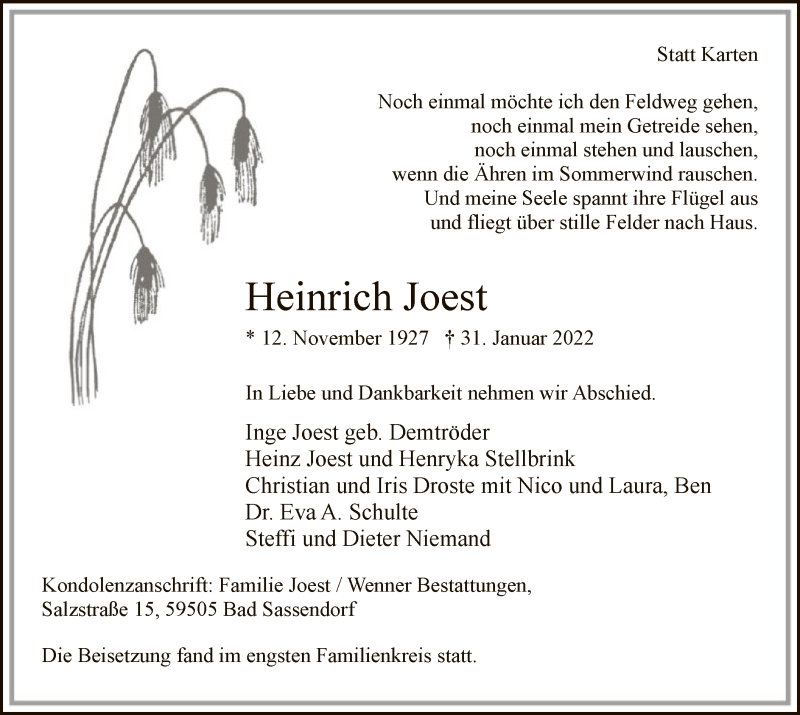 Hier finden Sie alle Traueranzeigen aus der Zeitung, die bisher für Heinrich Joest erschienen sind. Weitere Traueranzeigen, die in der Zeitung erscheinen, werden hier ebenfalls aufgelistet