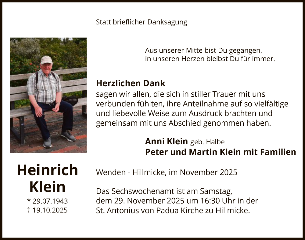 Hier finden Sie alle Traueranzeigen aus der Zeitung, die bisher für Heinrich Klein erschienen sind. Weitere Traueranzeigen, die in der Zeitung erscheinen, werden hier ebenfalls aufgelistet