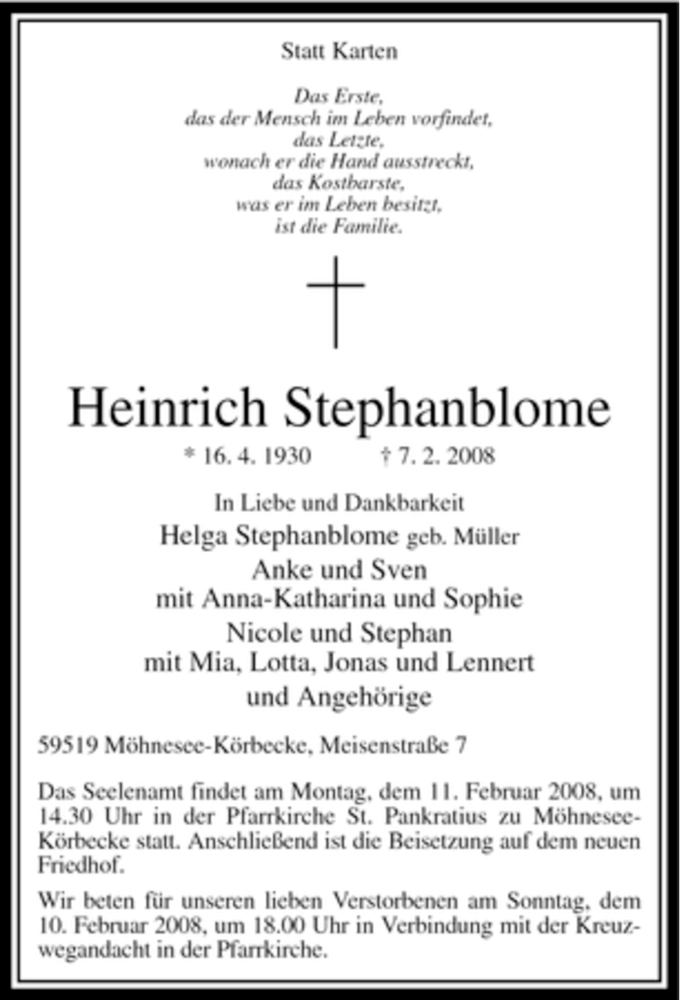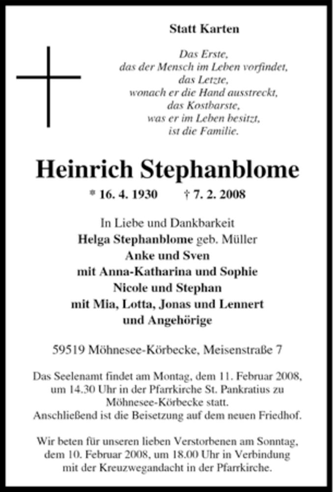 Hier finden Sie alle Traueranzeigen aus der Zeitung, die bisher für Heinrich Stephanblome erschienen sind. Weitere Traueranzeigen, die in der Zeitung erscheinen, werden hier ebenfalls aufgelistet
