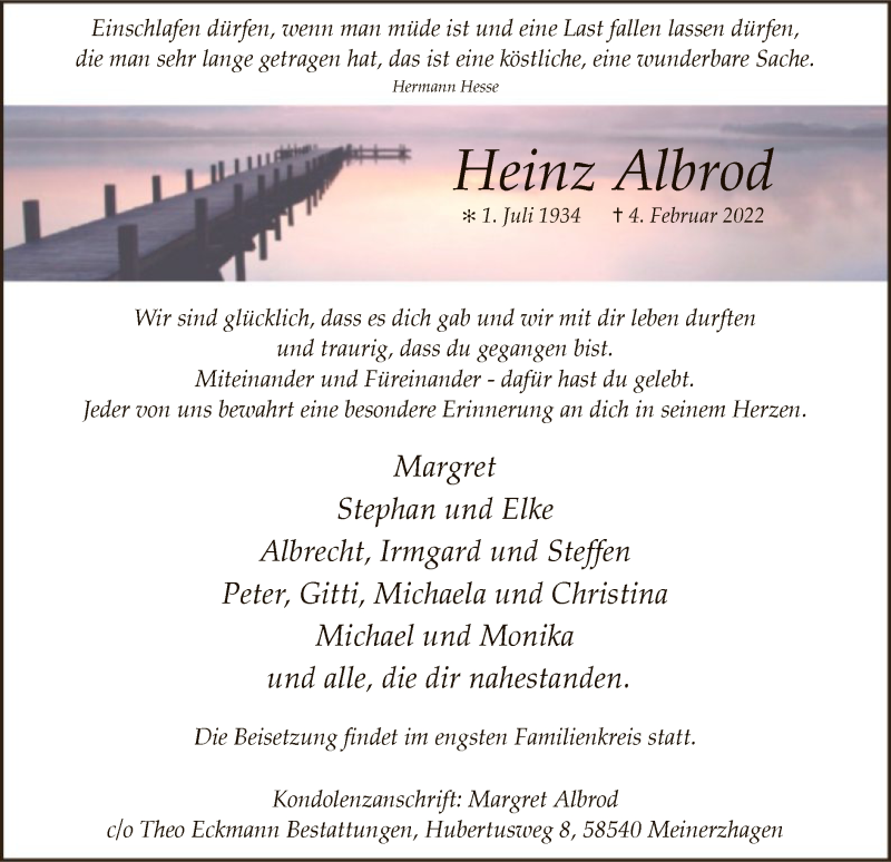 Hier finden Sie alle Traueranzeigen aus der Zeitung, die bisher für Heinz Albrod erschienen sind. Weitere Traueranzeigen, die in der Zeitung erscheinen, werden hier ebenfalls aufgelistet