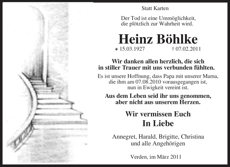 Hier finden Sie alle Traueranzeigen aus der Zeitung, die bisher für Heinz Böhlke erschienen sind. Weitere Traueranzeigen, die in der Zeitung erscheinen, werden hier ebenfalls aufgelistet