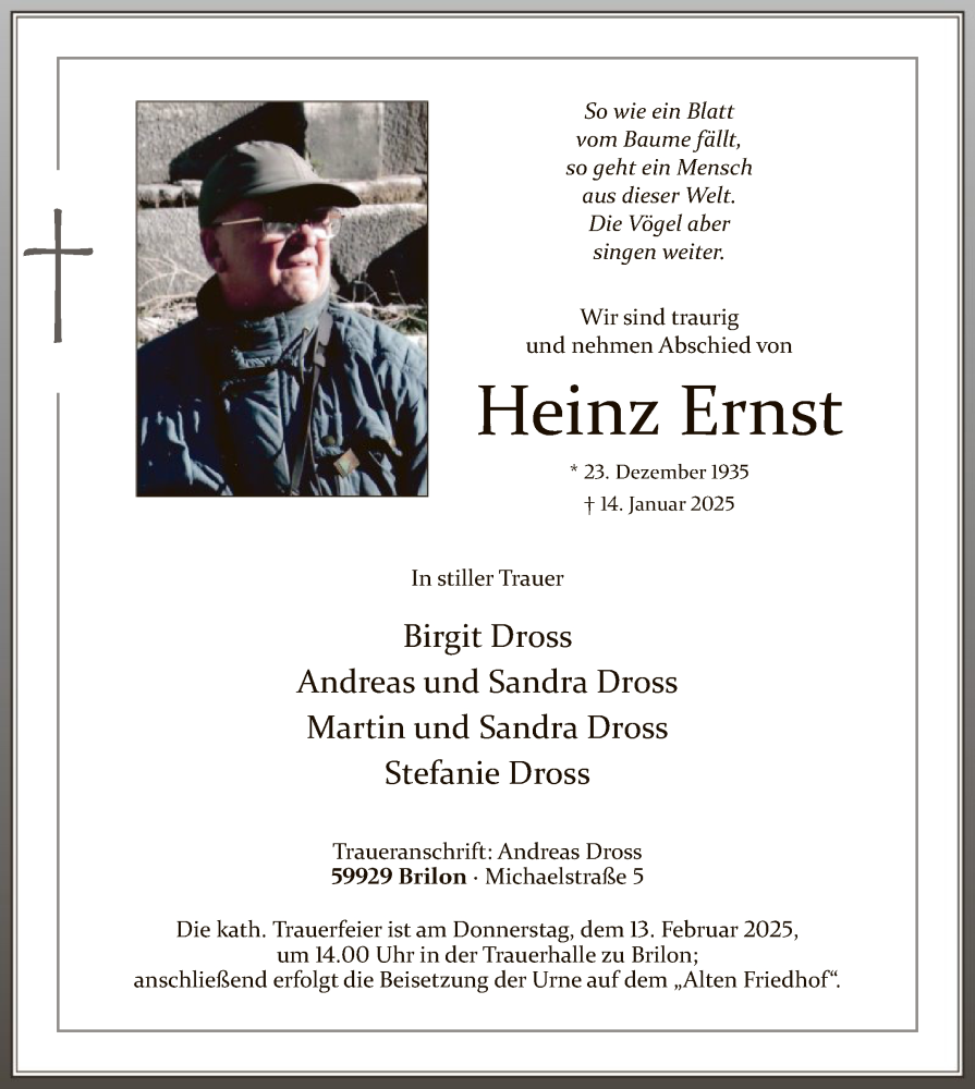 Hier finden Sie alle Traueranzeigen aus der Zeitung, die bisher für Heinz Ernst erschienen sind. Weitere Traueranzeigen, die in der Zeitung erscheinen, werden hier ebenfalls aufgelistet