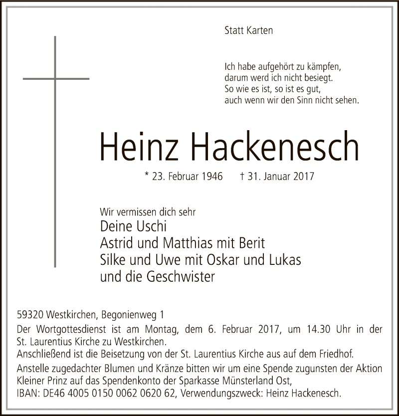 Hier finden Sie alle Traueranzeigen aus der Zeitung, die bisher für Heinz Hackenesch erschienen sind. Weitere Traueranzeigen, die in der Zeitung erscheinen, werden hier ebenfalls aufgelistet