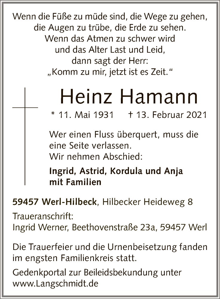 Hier finden Sie alle Traueranzeigen aus der Zeitung, die bisher für Heinz Hamann erschienen sind. Weitere Traueranzeigen, die in der Zeitung erscheinen, werden hier ebenfalls aufgelistet