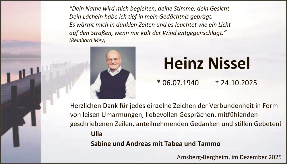 Hier finden Sie alle Traueranzeigen aus der Zeitung, die bisher für Heinz Nissel erschienen sind. Weitere Traueranzeigen, die in der Zeitung erscheinen, werden hier ebenfalls aufgelistet