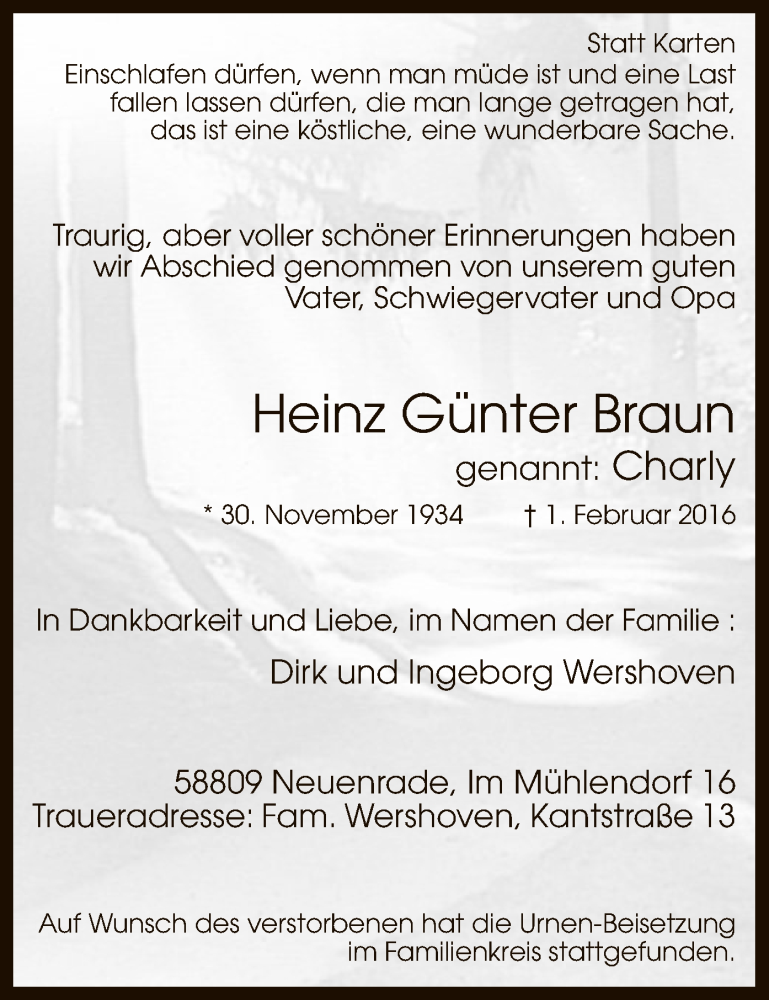 Hier finden Sie alle Traueranzeigen aus der Zeitung, die bisher für Heinz Günter Braun erschienen sind. Weitere Traueranzeigen, die in der Zeitung erscheinen, werden hier ebenfalls aufgelistet