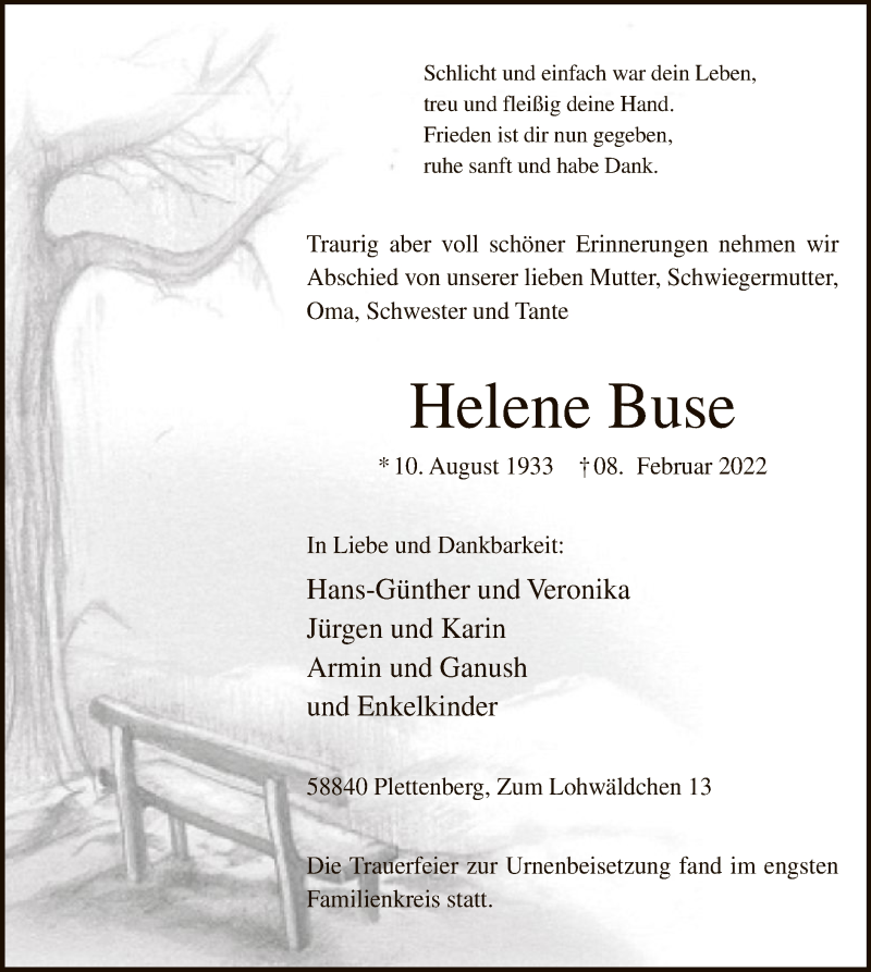 Hier finden Sie alle Traueranzeigen aus der Zeitung, die bisher für Helene Buse erschienen sind. Weitere Traueranzeigen, die in der Zeitung erscheinen, werden hier ebenfalls aufgelistet