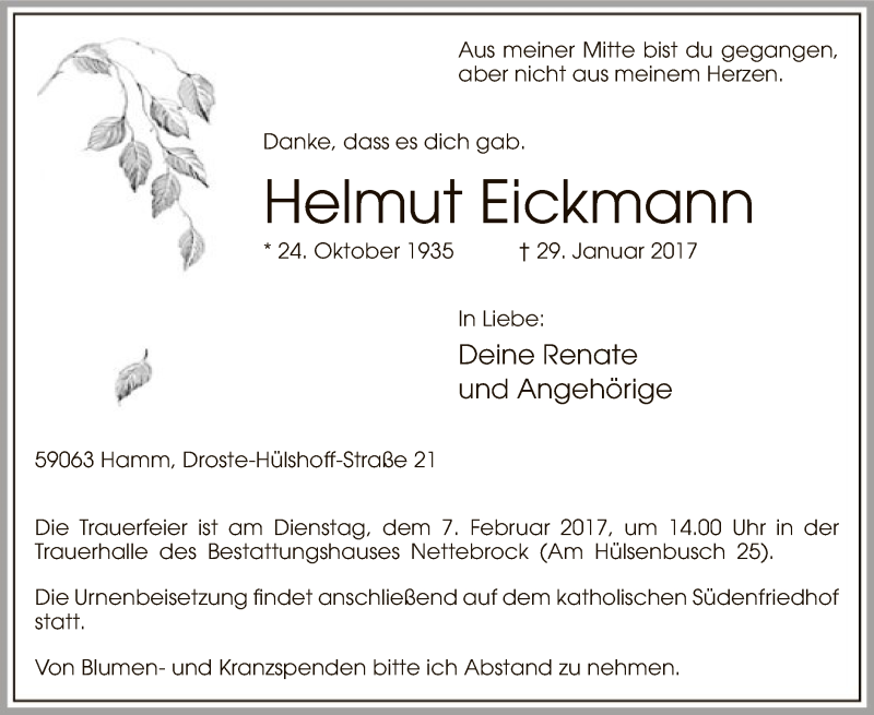 Hier finden Sie alle Traueranzeigen aus der Zeitung, die bisher für Helmut Eickmann erschienen sind. Weitere Traueranzeigen, die in der Zeitung erscheinen, werden hier ebenfalls aufgelistet