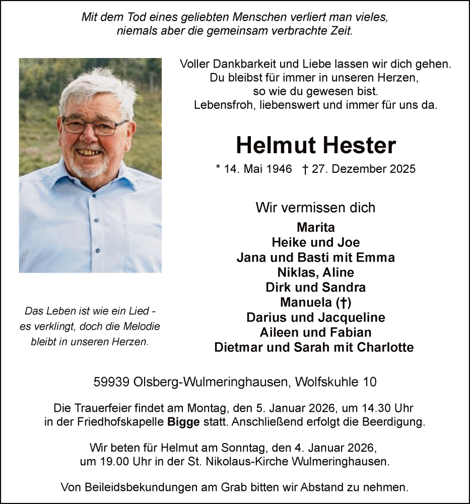 Hier finden Sie alle Traueranzeigen aus der Zeitung, die bisher für Helmut Hester erschienen sind. Weitere Traueranzeigen, die in der Zeitung erscheinen, werden hier ebenfalls aufgelistet