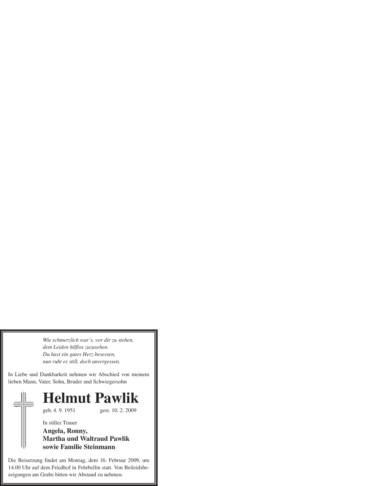 Hier finden Sie alle Traueranzeigen aus der Zeitung, die bisher für Helmut Pawlik erschienen sind. Weitere Traueranzeigen, die in der Zeitung erscheinen, werden hier ebenfalls aufgelistet