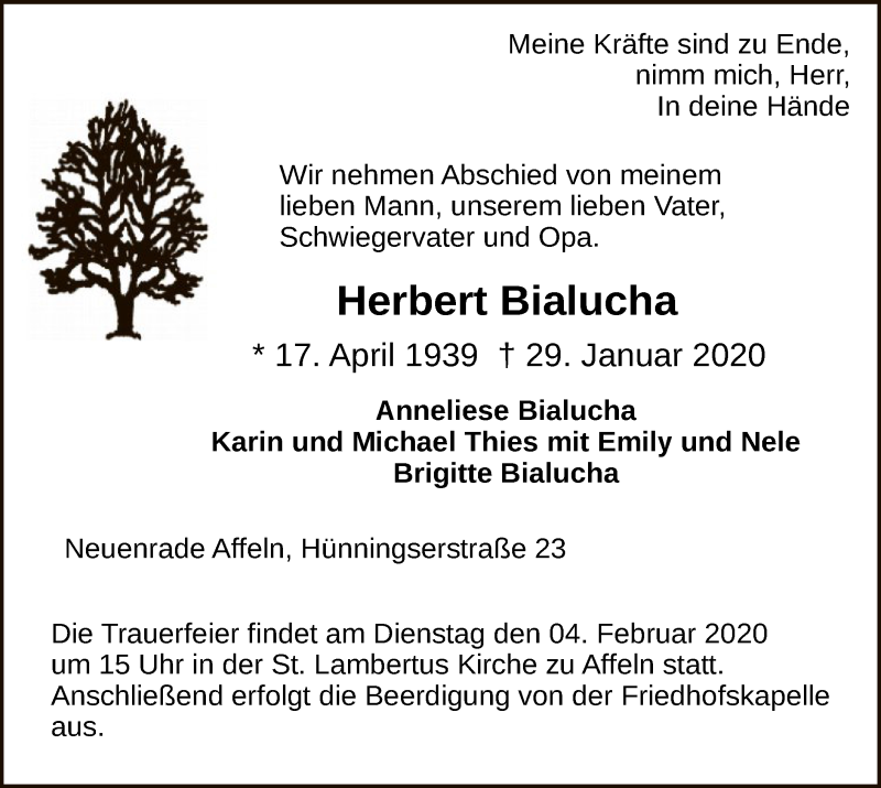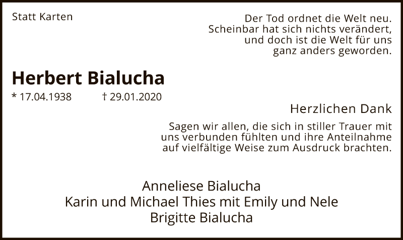 Hier finden Sie alle Traueranzeigen aus der Zeitung, die bisher für Herbert Bialucha erschienen sind. Weitere Traueranzeigen, die in der Zeitung erscheinen, werden hier ebenfalls aufgelistet
