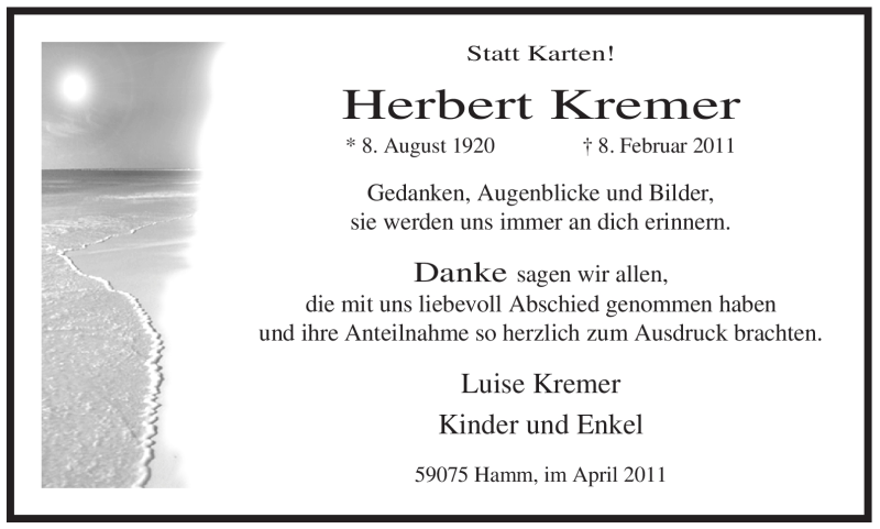 Hier finden Sie alle Traueranzeigen aus der Zeitung, die bisher für Herbert Kremer erschienen sind. Weitere Traueranzeigen, die in der Zeitung erscheinen, werden hier ebenfalls aufgelistet