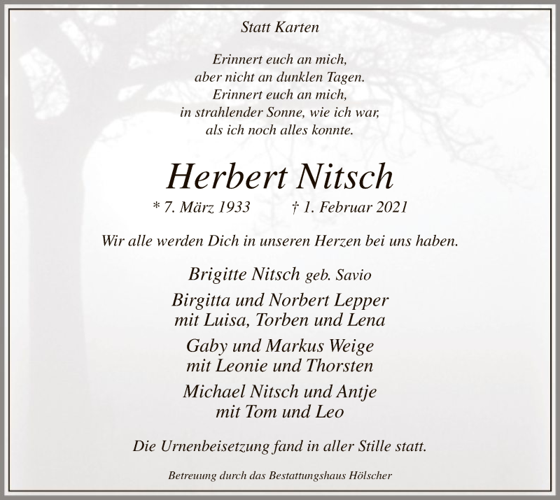 Hier finden Sie alle Traueranzeigen aus der Zeitung, die bisher für Herbert Nitsch erschienen sind. Weitere Traueranzeigen, die in der Zeitung erscheinen, werden hier ebenfalls aufgelistet