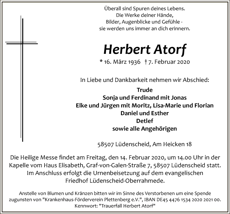 Hier finden Sie alle Traueranzeigen aus der Zeitung, die bisher für Heribert Atorf erschienen sind. Weitere Traueranzeigen, die in der Zeitung erscheinen, werden hier ebenfalls aufgelistet