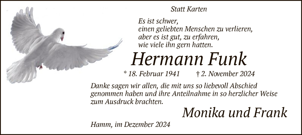 Hier finden Sie alle Traueranzeigen aus der Zeitung, die bisher für Hermann Funk erschienen sind. Weitere Traueranzeigen, die in der Zeitung erscheinen, werden hier ebenfalls aufgelistet