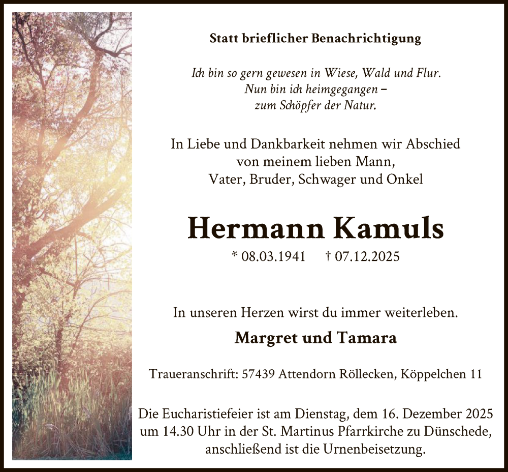 Hier finden Sie alle Traueranzeigen aus der Zeitung, die bisher für Hermann Kamuls erschienen sind. Weitere Traueranzeigen, die in der Zeitung erscheinen, werden hier ebenfalls aufgelistet