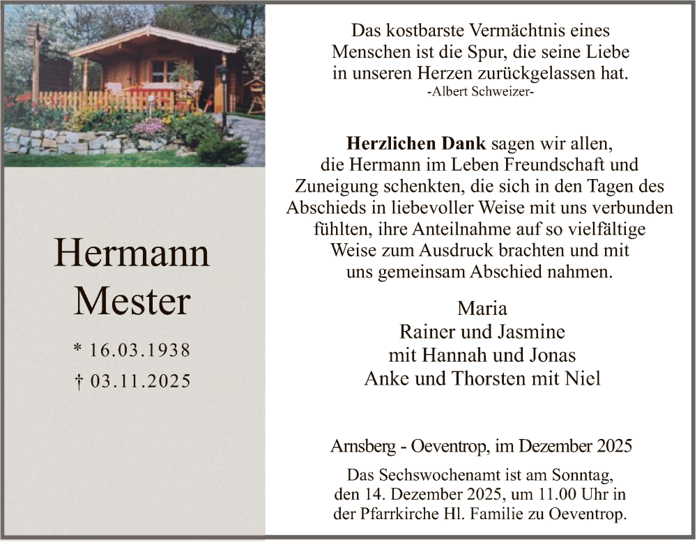 Hier finden Sie alle Traueranzeigen aus der Zeitung, die bisher für Hermann Mester erschienen sind. Weitere Traueranzeigen, die in der Zeitung erscheinen, werden hier ebenfalls aufgelistet