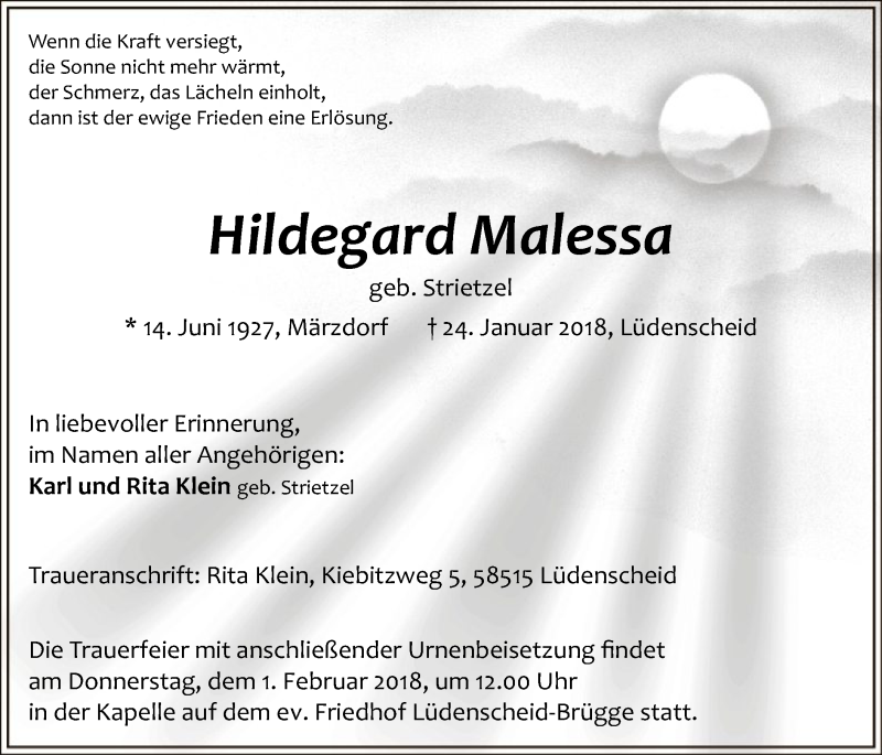 Hier finden Sie alle Traueranzeigen aus der Zeitung, die bisher für Hildegard Malessa erschienen sind. Weitere Traueranzeigen, die in der Zeitung erscheinen, werden hier ebenfalls aufgelistet