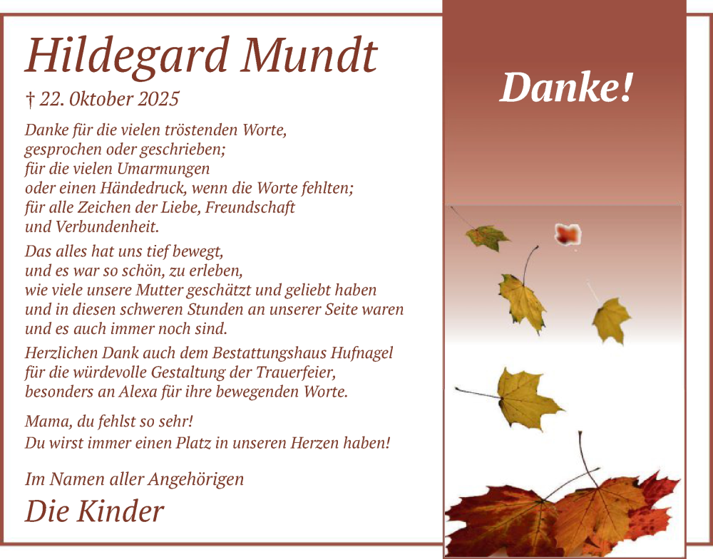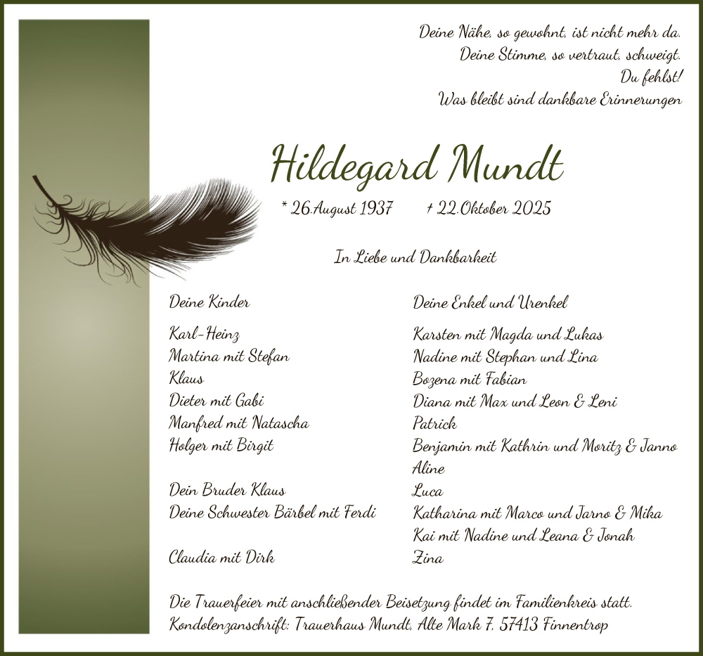 Hier finden Sie alle Traueranzeigen aus der Zeitung, die bisher für Hildegard Mundt erschienen sind. Weitere Traueranzeigen, die in der Zeitung erscheinen, werden hier ebenfalls aufgelistet