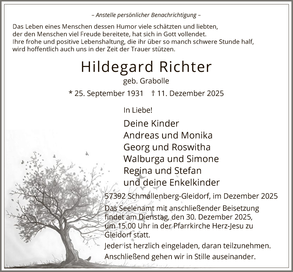 Hier finden Sie alle Traueranzeigen aus der Zeitung, die bisher für Hildegard Richter erschienen sind. Weitere Traueranzeigen, die in der Zeitung erscheinen, werden hier ebenfalls aufgelistet