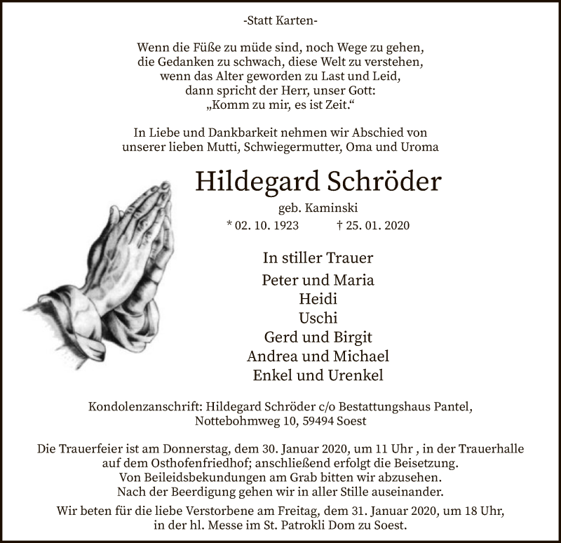 Hier finden Sie alle Traueranzeigen aus der Zeitung, die bisher für Hildegard Schröder erschienen sind. Weitere Traueranzeigen, die in der Zeitung erscheinen, werden hier ebenfalls aufgelistet
