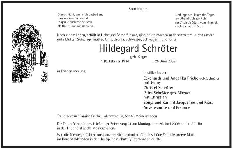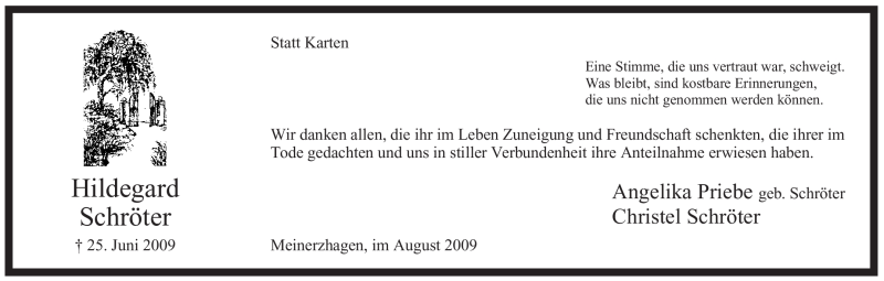 Hier finden Sie alle Traueranzeigen aus der Zeitung, die bisher für Hildegard Schröter erschienen sind. Weitere Traueranzeigen, die in der Zeitung erscheinen, werden hier ebenfalls aufgelistet