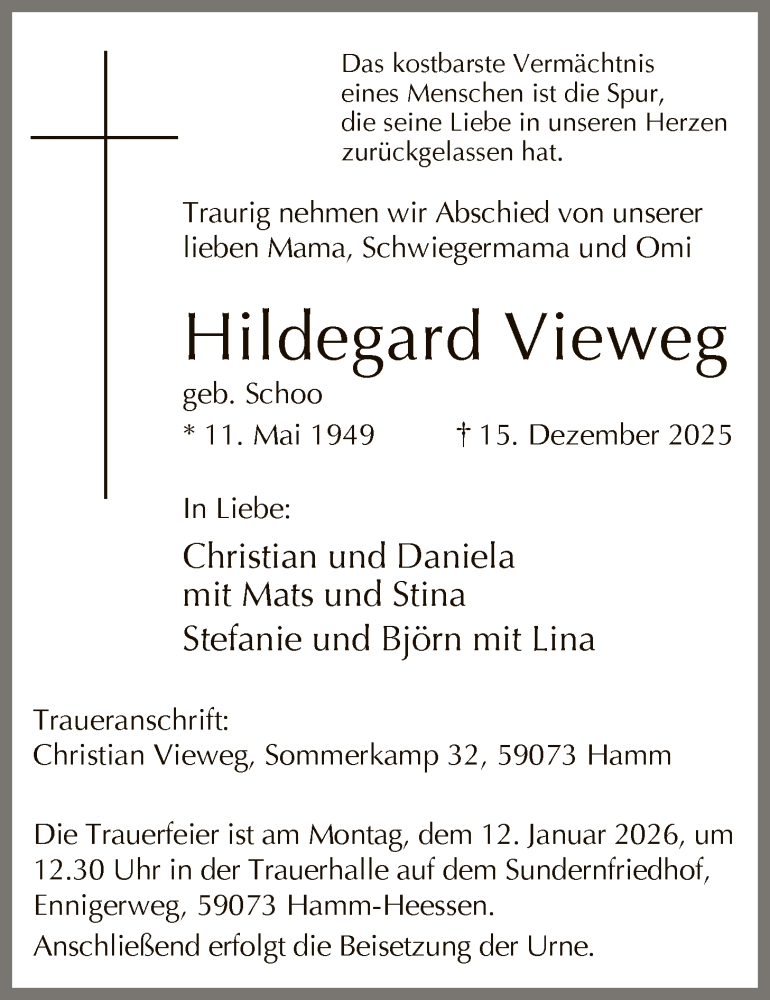 Hier finden Sie alle Traueranzeigen aus der Zeitung, die bisher für Hildegard Vieweg erschienen sind. Weitere Traueranzeigen, die in der Zeitung erscheinen, werden hier ebenfalls aufgelistet