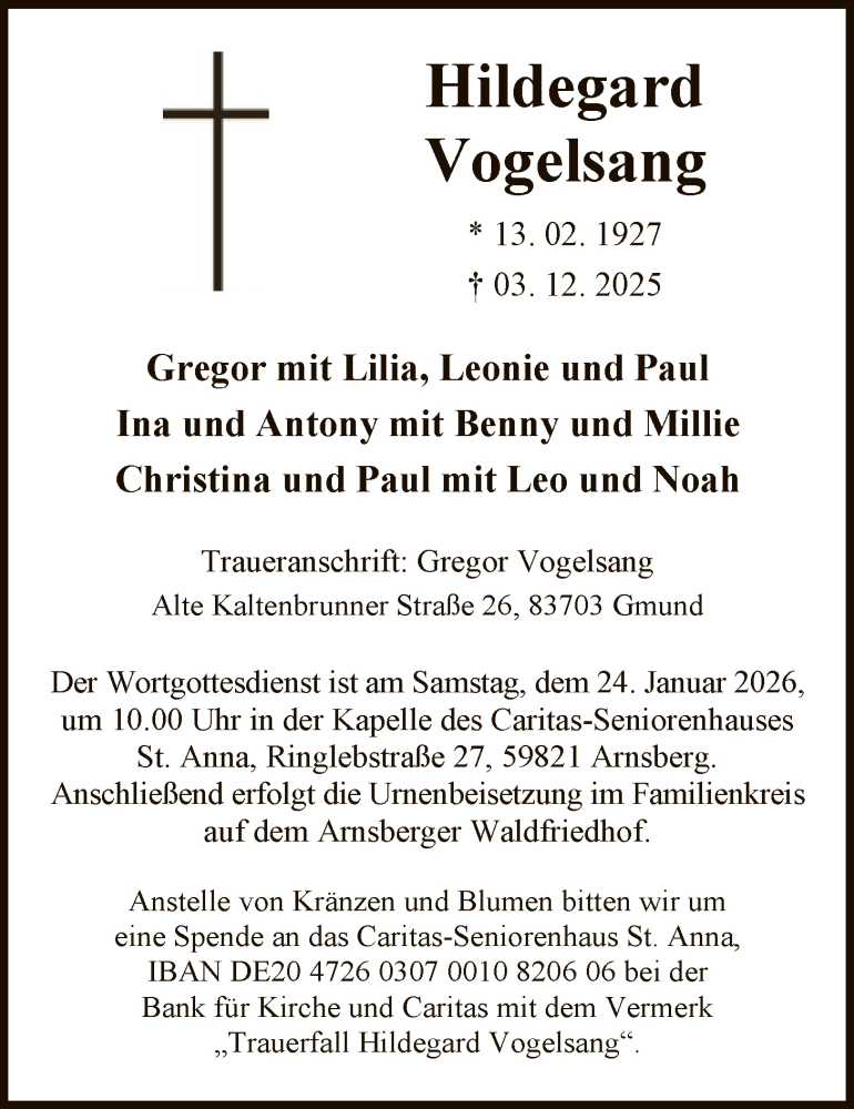 Hier finden Sie alle Traueranzeigen aus der Zeitung, die bisher für Hildegard Vogelsang erschienen sind. Weitere Traueranzeigen, die in der Zeitung erscheinen, werden hier ebenfalls aufgelistet
